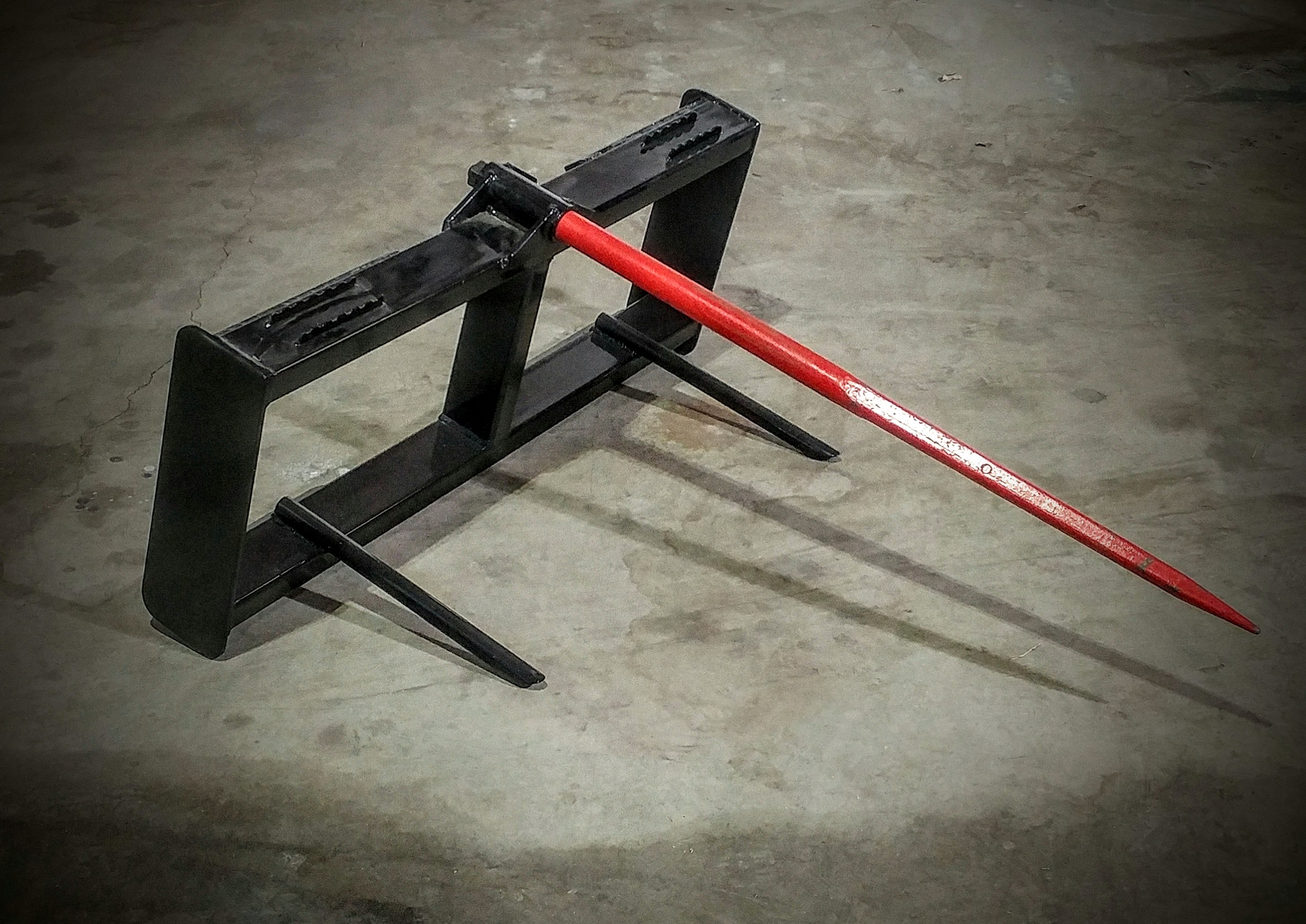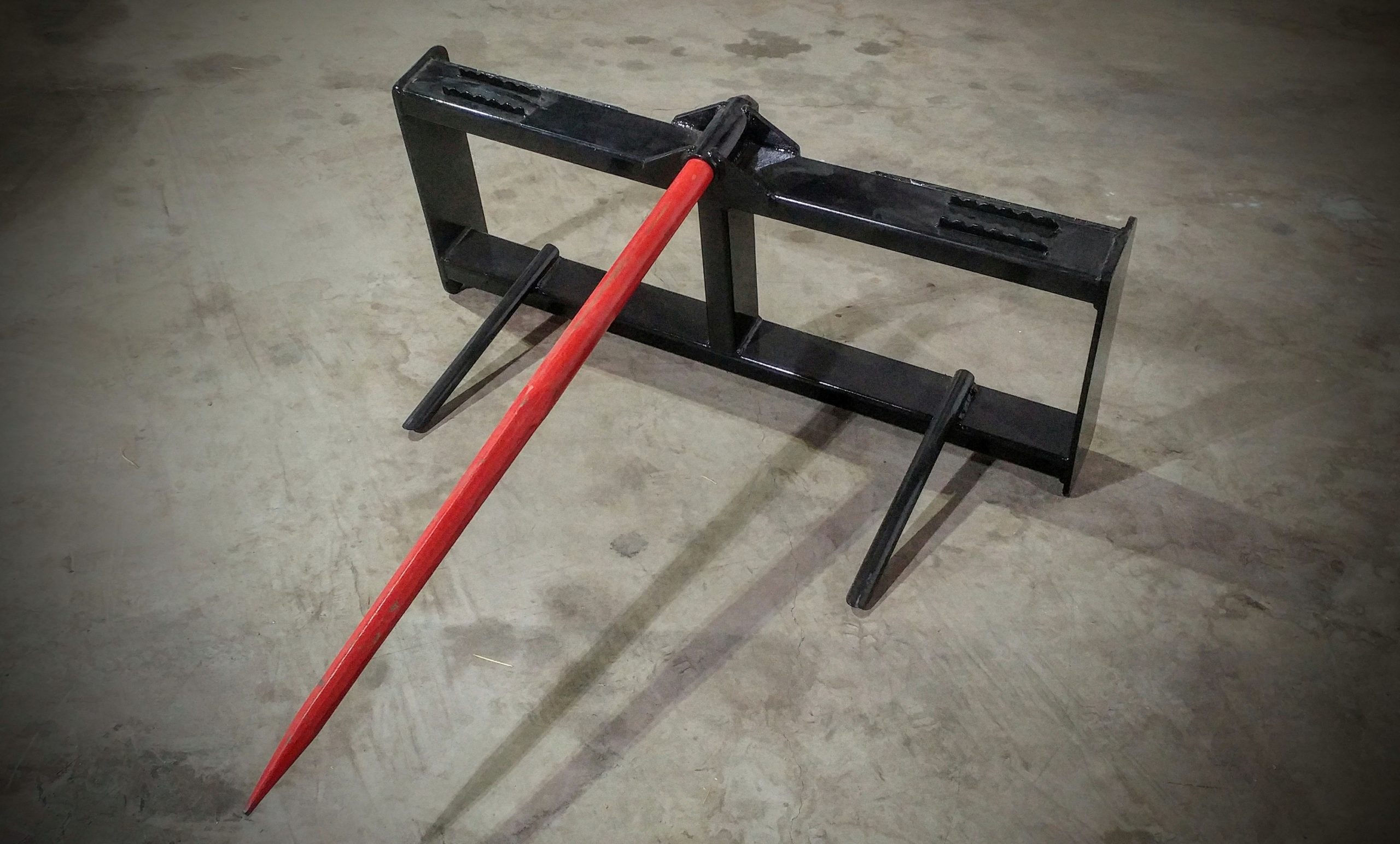 Made Right here in Montana this Bale spear is intended for most skid steer and small to medium size tractor quick attach.